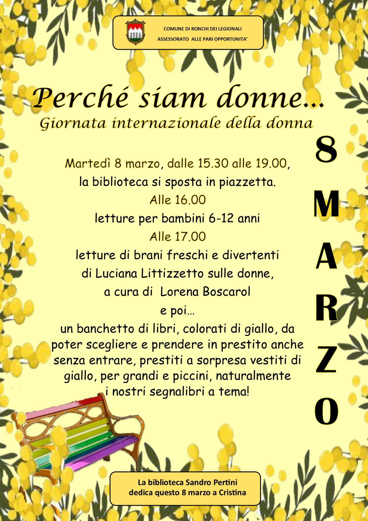 In occasione dell’8 marzo la biblioteca colora la piazzetta di giallo! Letture per bambini e per adulti, prestiti a sorpresa e tanti libri tutti vestiti del colore della mimosa.