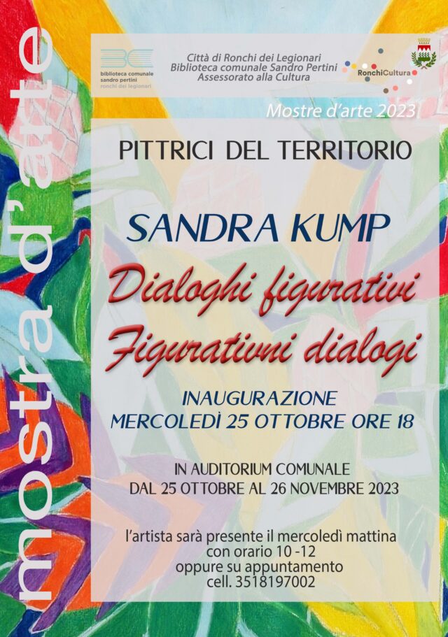 Dal 25 ottobre al 26 novembre 2023 – Auditorium Comunale “Casa della Cultura” Inaugurazione: mercoledì 25 ottobre, ore 18:00 DIALOGHI FIGURATIVI di Sandra Kump   L’artista sarà presente i mercoledì con orario 10-12.